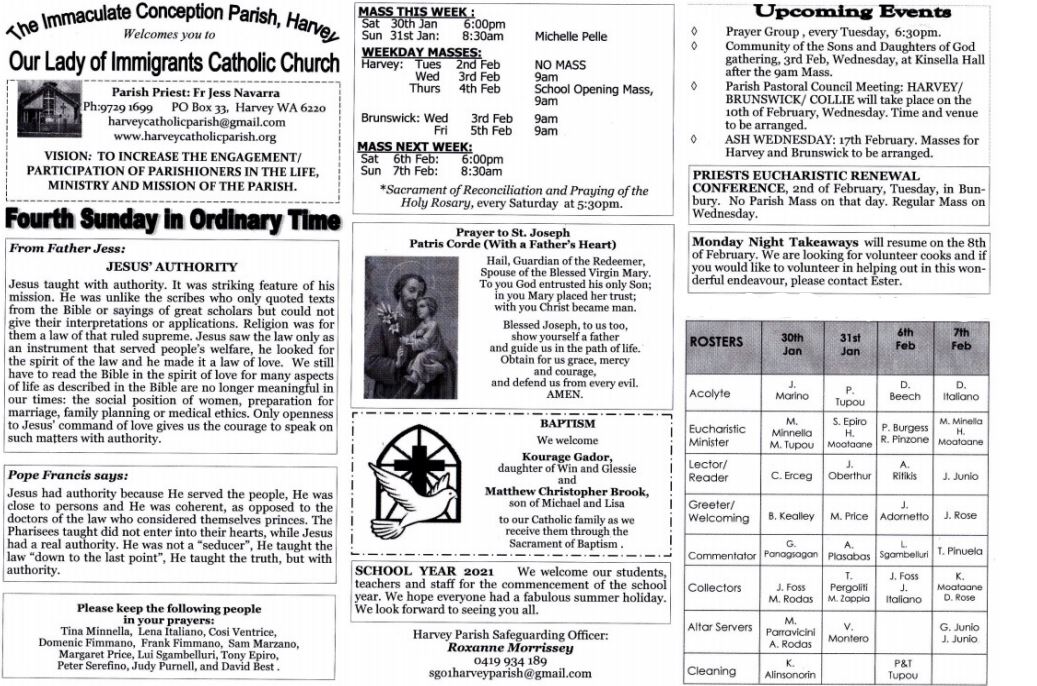 Fourth Sunday in Ordinary Time January 29, 2021 harveycatholicparish 4th-sundayDownload Share this: Click to share on X (Opens in new window) X Click to share on Facebook (Opens in new window) Facebook Like Loading... Related Published by harveycatholicparish View all posts by harveycatholicparish
