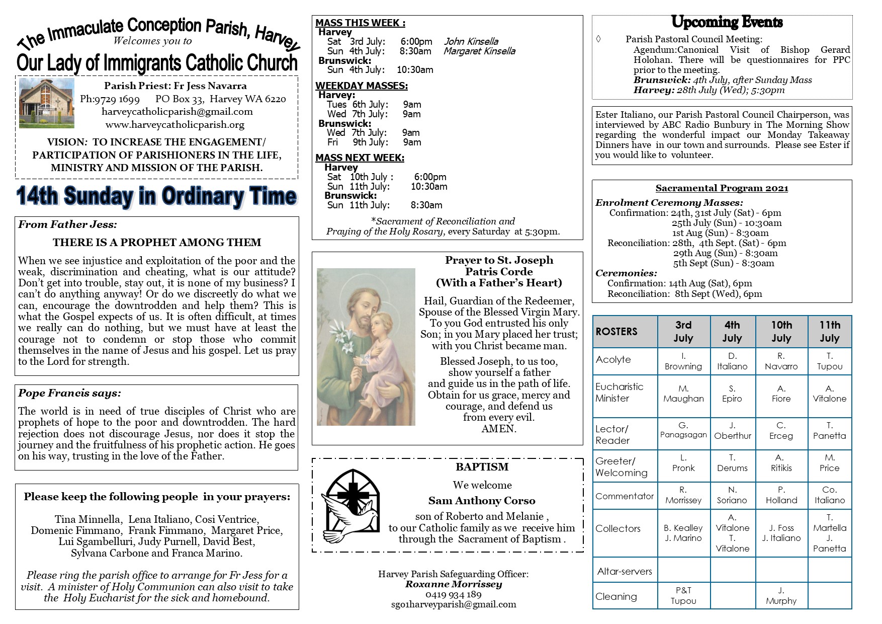 Fourteenth Sunday in Ordinary Time July 2, 2021 harveycatholicparish 14th-sundayDownload Share this: Click to share on X (Opens in new window) X Click to share on Facebook (Opens in new window) Facebook Like Loading... Related Published by harveycatholicparish View all posts by harveycatholicparish