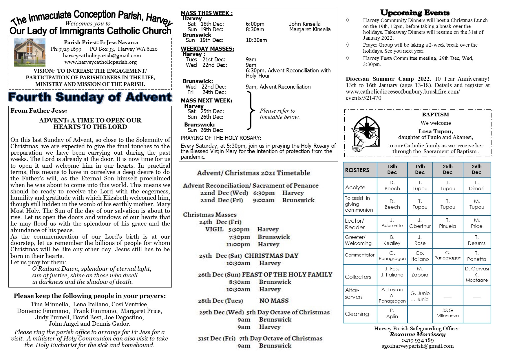 Fourth Sunday of Advent December 17, 2021 harveycatholicparish 4th-sunday-of-adventDownload Share this: Click to share on X (Opens in new window) X Click to share on Facebook (Opens in new window) Facebook Like Loading... Related Published by harveycatholicparish View all posts by harveycatholicparish