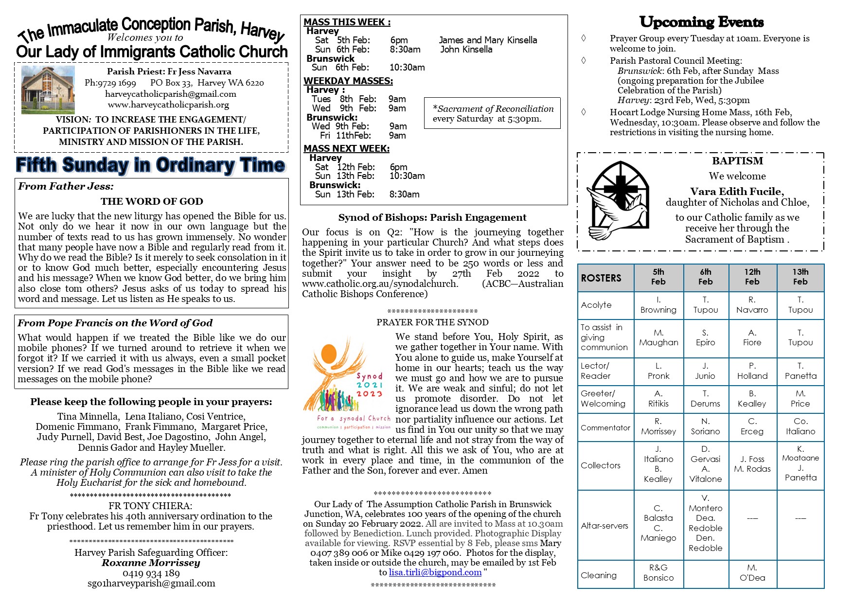 Fifth Sunday in Ordinary Time February 4, 2022 harveycatholicparish 5th-sundayDownload Share this: Click to share on X (Opens in new window) X Click to share on Facebook (Opens in new window) Facebook Like Loading... Related Published by harveycatholicparish View all posts by harveycatholicparish